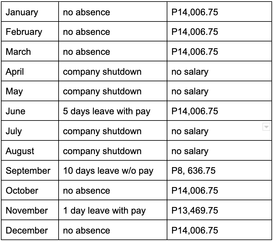 L.A. No. 18-21 provides a scenario using the minimum wage in Metro Manila to illustrate the formula, taking into consideration the possibility that the company shut down during the multiple lockdowns —